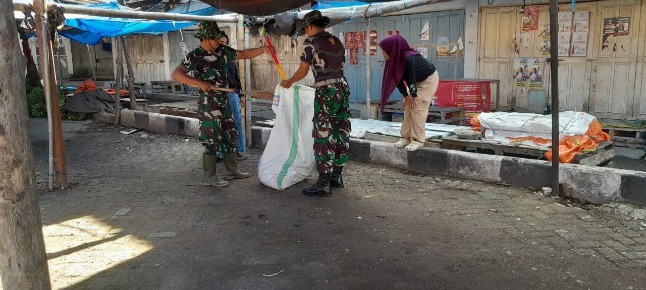 SIDRAP – Anggota Koramil 1420-03/Maritengngae Kodim 1420/Sidrap bersama warga setempat menunjukkan semangat gotong royong yang tinggi dengan melaksanakan kegiatan Karya Bakti pembersihan di Pasar Sentral Pangkajene, Kecamatan Maritengngae, Kabupaten Sidrap, pada hari Minggu, 19 Oktober 2025.